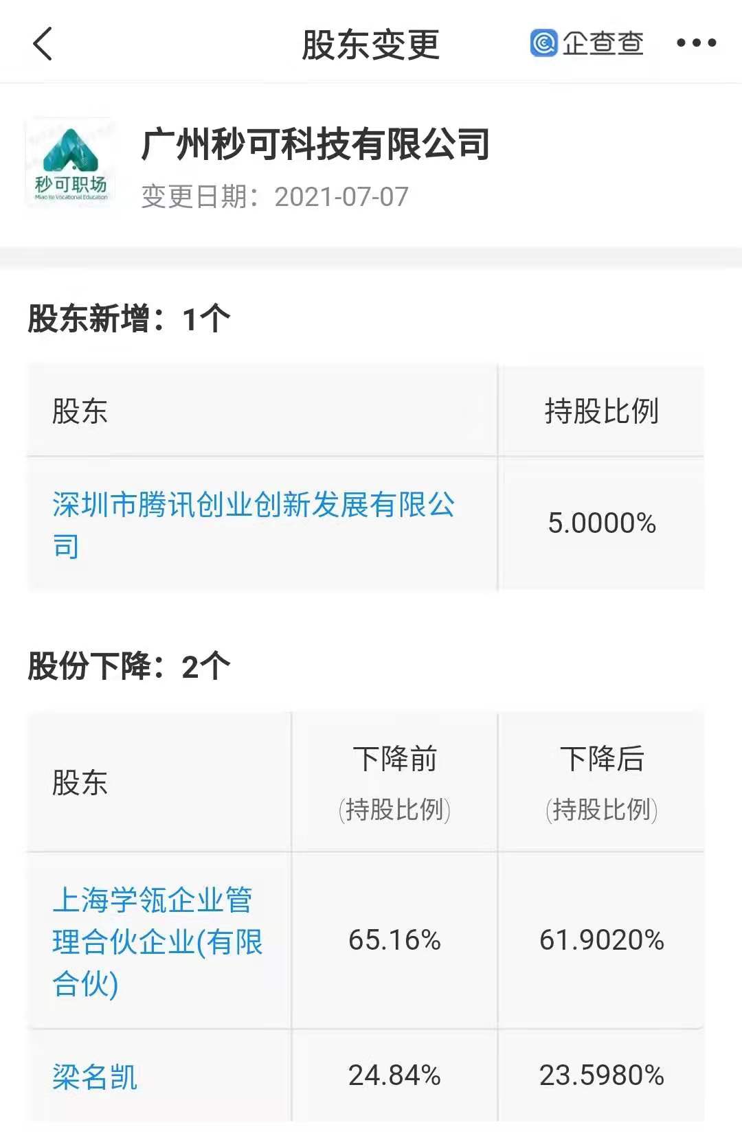 企查查显示,7月5日,广州秒可科技有限公司发生工商变更,新增股东深圳市腾讯创业创新发展有限公司,同时公司注册资本由222.22万元增加至233.92万元。