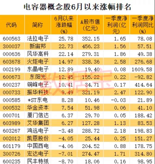 当前A股主业涵盖电容器的上市公司有17家。二级市场表现来看,截至7月7日收盘,法拉电子、新宙邦、风华高科、火炬电子、东晶电子、东阳光、铜峰电子等累计涨幅超过10%,法拉电子涨幅25.78%排在第一位。市盈率最低的几只依次是*ST东电、凯恩股份、艾华集团、华金资本、民丰特纸等。(数据宝)