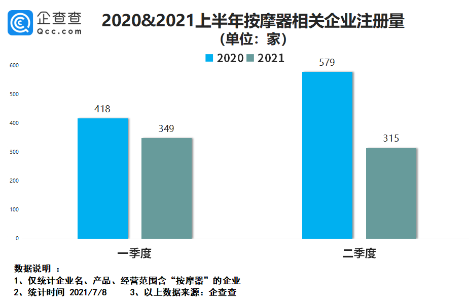 从今年的注册量来看,2021年上半年,我国按摩器企业注册量为664家,同比下跌了33.4%。从各季度注册量来看,一季度和二季度分别注册了349家、315家相关企业。