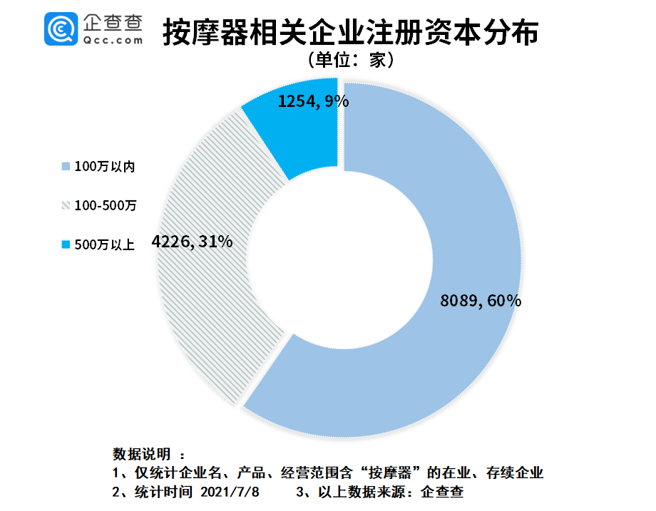 从注册资本来看,数据图显示,按摩器相关企业注册资本在100万元以内的企业数量占60%,注册资本在100-500万元和500万元以上的分别占31%和9%。