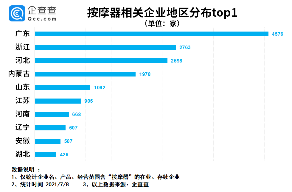 企查查数据显示,目前我国现存“按摩器”相关企业共1.4万家。2019年是企业注册量的高峰期,全年注册了2754家企业,同比增长了12.4%;今年上半年共注册了664家企业,同比下跌了33.4%。从省份分布来看,广东省以4576家企业超过其他省份,其次是浙江、河北。在人们普遍面临工作生活压力、健康需求旺盛的社会环境下,有放松功能的按摩产品正迎来新的春天。