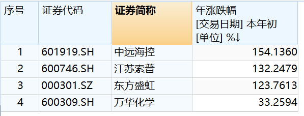 如前文提及的业绩高增长股。数据显示,截至7月8日收盘,业绩预告净利润大涨的中远海控、江苏索普、东方盛虹年涨幅分别高达154.14%、132.25%、123.76%,大幅跑赢年内最强股指——创业板指(15.73%)。万华化学也有33.26%的不俗表现。
