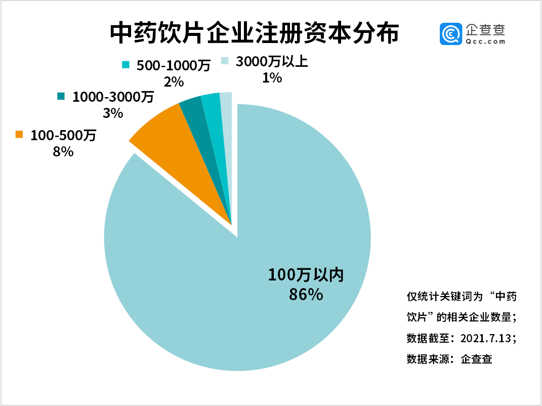 从注册资本来看,中药饮片企业注册资本多集中在100万元以内,共占86%。注册资本在100-500万元和1000-3000万元的分别占8%和3%。