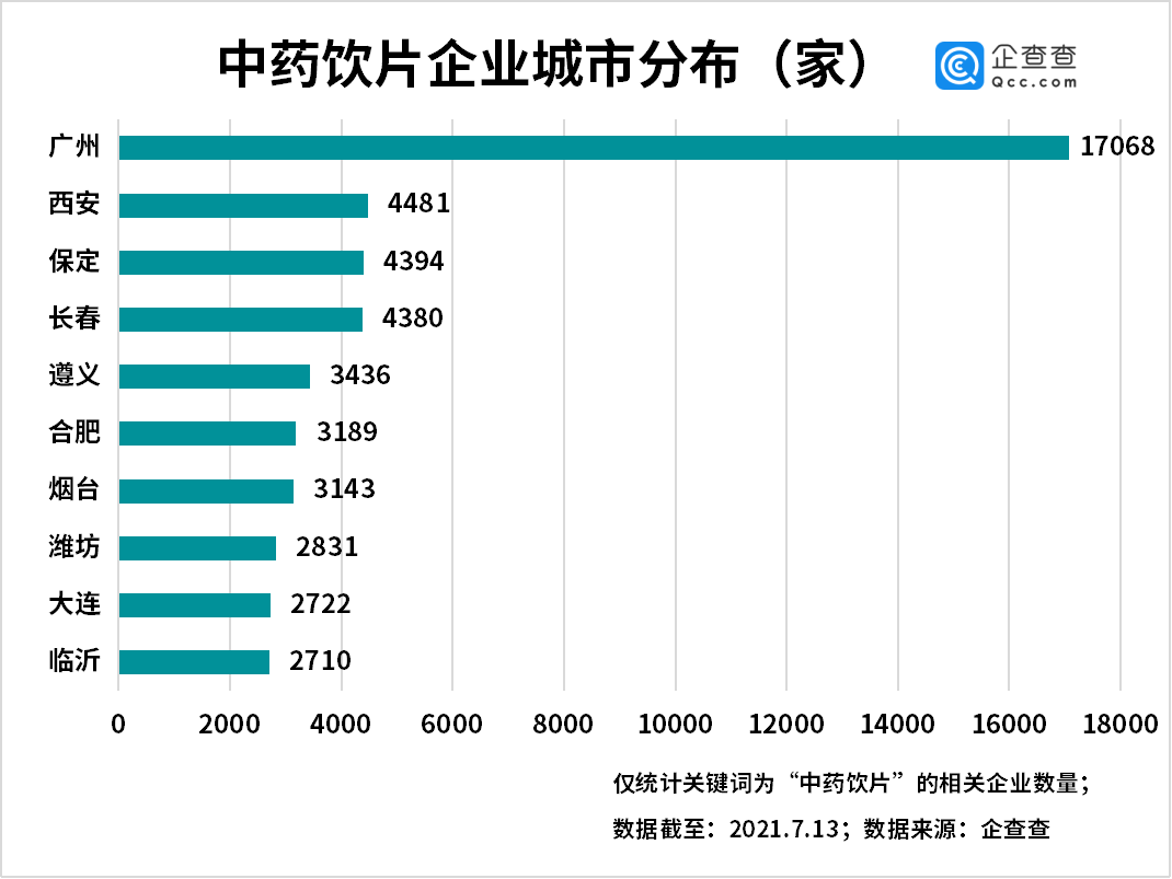 从城市分布来看,广州市一骑绝尘,共有中药饮片企业1.71万家,西安、保定、长春以及遵义分别有相关企业4481家、4394家、4380家和3436家,排名前五位。