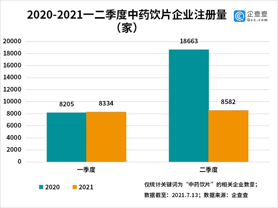 2021年上半年共注册中药饮片企业1.69万家,同比减少37%。2021年第二季度共注册中药饮片企业8252家,同比减少54%、环比减少3%,整体呈下降趋势。