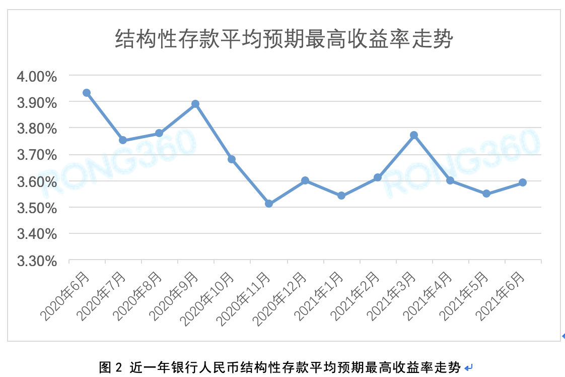就收益率而言,据悉,6月份发行的人民币结构性存款平均预期最高收益率为3.59%,同比下降34BP。过去一年来,结构性存款平均预期最高收益率一直呈震荡下跌趋势,直至今年,收益走势才相对平稳。