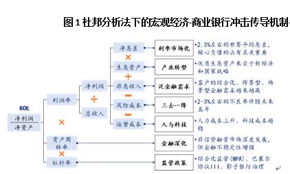 由于历史条件所限,中国的商业银行还没有经历过一次完整的经营周期,加上固有的政府兜底和国家信用背书理念,大部分商业银行对经济周期缺乏足够的敏感,在制定战略目标和举措时,对未来的宏观经济环境考虑不足,制定的目标和举措往往超出经济金融环境的承载能力,造成较大的战略偏离和战略风险。因此,商业银行制定战略时应该具有独立思考能力,洞悉宏观经济变动冲击商业银行经营绩效的作用机制,使银行个体的战略规划与中国经济未来发展趋势相适应。下图按照杜邦分解的方法建立了未来几年宏观经济变动对商业银行的冲击传导机制。