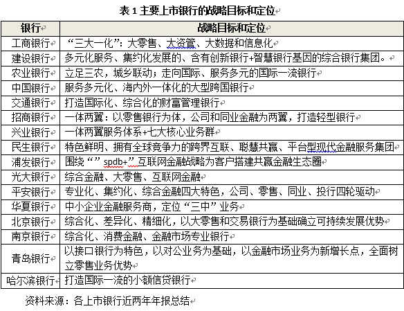 5、精细化、综合化、集约化、轻型化等转型战略。业务层面的战略之外,在中后台管理和组织架构方面,银行也积极展开了转型,管理的精细化、服务的综合化、资本的集约化、资产的轻型化,这四化成为银行管理转型的主要方向。在组织架构方面,事业部改革则成为各家银行进行推动专业化战略的重要方向。表1列示了主要上市银行的战略目标和定位: