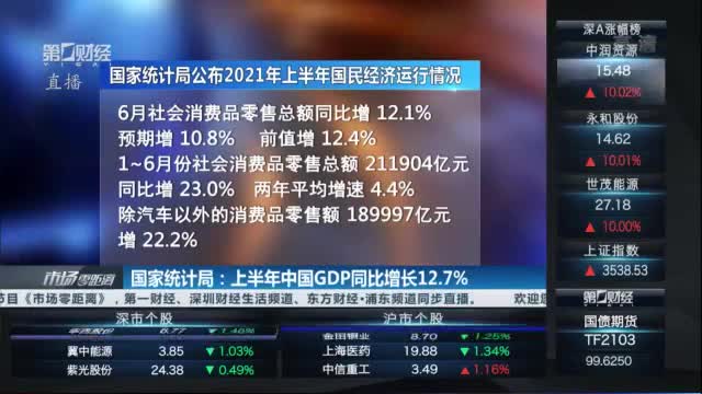 国家统计局今天上午公布上半年宏观经济数据,初步核算,上半年国内生产总值532167亿元,按可比价格计算,同比增长12.7%,比一季度回落5.6个百分点;两年平均增长5.3%,两年平均增速比一季度加快0.3个百分点。1—6月份,社会消费品零售总额211904亿元,同比增长23.0%,两年平均增速为4.4%。其中,除汽车以外的消费品零售额189997亿元,增长22.2%。1—6月份,规模以上工业增加值同比增长15.9%,两年平均增长7.0%。