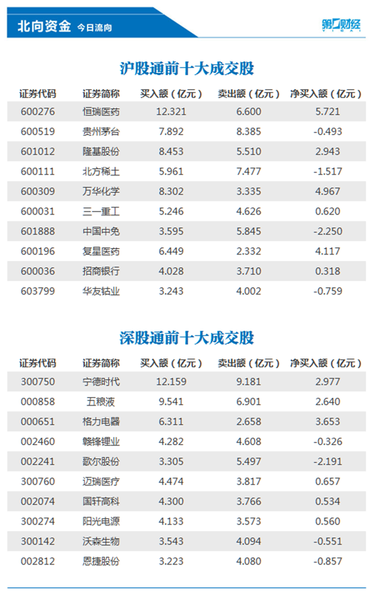 前十大成交股中,净买入额居前三的是恒瑞医药、万华化学、复星医药,分别获净买入5.72亿元、4.97亿元、4.12亿元。