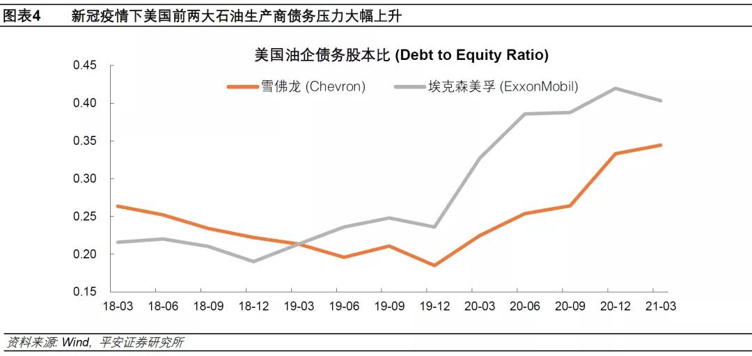 2)油企将更多利润用于偿债而不是投资。2010-2015年的五年里,原油价格在80-100美元/桶左右,而2017-2019年的三年里,原油价格在50-70美元/桶左右。这一价位上油企能够盈利,但利润空间已然不及2015年以前水平,因此美国油企不得不加大举债以维持增产。2020年疫情冲击和油价下跌进一步加剧了油企债务压力。例如,美国前两大石油产商雪佛龙和埃克森美孚的债务股本比率,分别由2019年底的0.19和0.24,大幅增加至2021年1季度的0.34和0.40(图表4)。因此,油价上涨后,油企需要将更多利润用于债务偿还,且考虑到投资者分红回报的高要求,现阶段油企可能更加顾不上增加钻井投资。例如,雪佛龙2021年1季度财报显示,其在美石油开采等上游业务收入为9.41亿美元,比2020年1季度增长了7亿美元(同比增长74%),然而其“全部其他支出”(包括现金管理、债务偿还、企业运营等)高达9.78亿美元(同比增长57%),继而其1季度资本开支同比减少了43%。