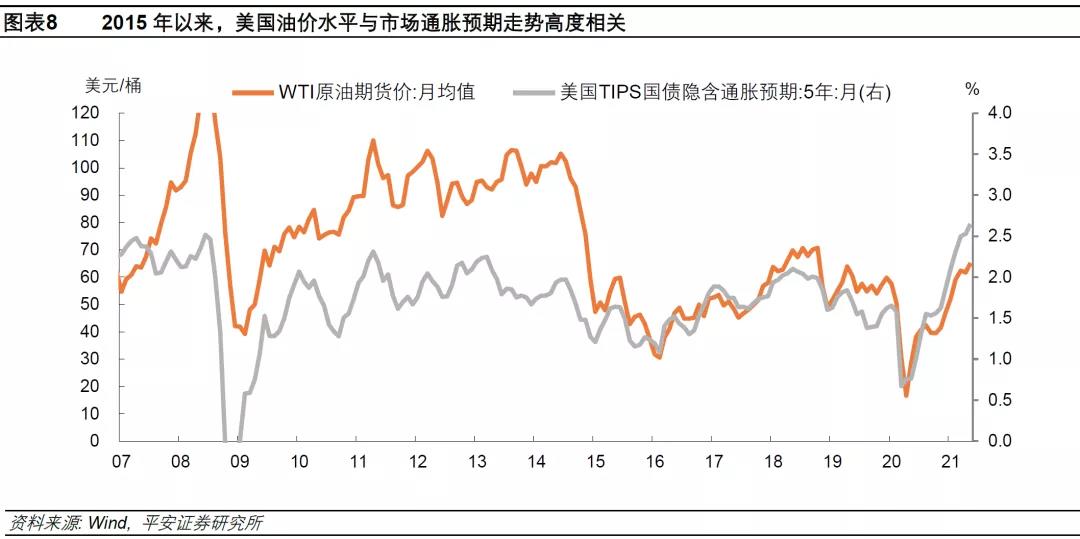 两方面影响值得关注:其一,油价上涨可能刺激美国通胀预期走高,“再通胀”交易有望回归。2015年以来,美国油价水平(不是增速)与美债市场隐含通胀预期的相关性愈发显著,高于70美元/桶的油价可能会明显抬升市场通胀预期。其二,今年9-10月中国PPI和美国CPI同比增速可能“二次探顶”(假设油价为70美元/桶)。中国方面,由于下游行业向终端消费者进行成本转移的能力较弱,需更加重视下游企业利润承压的状况;美国方面,需警惕油价和通胀指标对美联储政策节奏的影响。若通胀指标和通胀预期走高,美联储迈向Taper的步伐可能进一步加快,其“通胀暂时论”说服力减弱,市场波动风险随之上升。