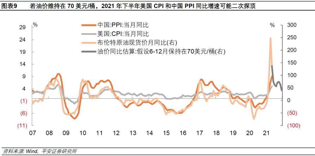 其二,下半年美国CPI和中国PPI同比增速可能二次探顶。历史上,油价、中国PPI和美国CPI三者的同比增速有较高的同步性(图表9)。假设今年6-12月油价均处于70美元/桶的水平,因基数原因,今年9月和10月油价同比增速将从8月的55%重新再度攀升至70%以上,相应地,中国PPI和美国CPI同比增速可能在9-10月二次探顶。我们的基准测算显示(使用2000年以来数据进行OLS回归分析并预测),中国PPI同比增速在今年9月和10月分别为5.7%和5.9%,美国CPI同比增速在9月和10月均为3.5%。