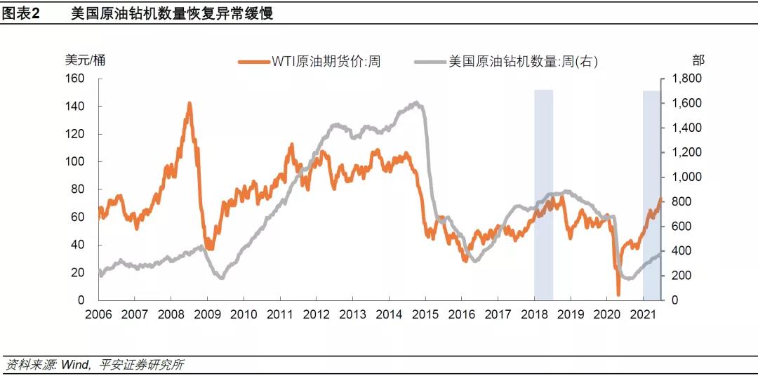 本轮原油供给的弹性明显弱于历史表现及我们的预期,尤其是美国钻井增速异常缓慢。过去十年,如果油价高于55-60美元/桶,那么美国页岩油生产商通常都会增产,并从OPEC+攫取市场份额。根据达拉斯联储6月公布的调查数据,当WTI原油价格每桶达58美元后,至少超过半数的美国受访原油生产商能够“有盈利地”新开钻井。而美国页岩油革命后,从新增钻机到产量切实增加的周期已经缩短至半年左右。因此,根据以往经验,美国原油供给能对油价的上涨较快地做出反应。然而,2021年美国原油钻机数量恢复异常缓慢,2月中旬至6月中旬,WTI油价由每桶58美元升至70美元,钻机数量仅增加了约70部,至370部。对比2018年1月至5月期间,WTI油价由每桶59美元升至70美元,钻机数量增加了约100部,至850部。从钻机数量与油价的对比关系上看,截至今年6月18日,美国原油钻机数为373部,接近2016年7月时的水平,当时WTI油价仅为每桶45美元左右(图表2)。