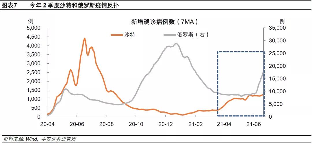 第二,沙特和俄罗斯的疫情反扑亦可能弱化OPEC+增产动力。沙特自2021年4月以来新增新冠确诊数重新上升,截至6月下旬单日新增确诊约1200例,而1月单日新增仅约200例。俄罗斯疫情自6月初以来亦显著加重,6月下旬单日新增确诊已超过1600例,约为4-5月水平的两倍(图表7)。疫情反扑一方面一定程度上直接影响石油生产活动,另一方面可能强化OPEC+对地区乃至全球疫情风险以及石油需求恢复前景的担忧,继而在增产计划的讨论中更偏于谨慎。
