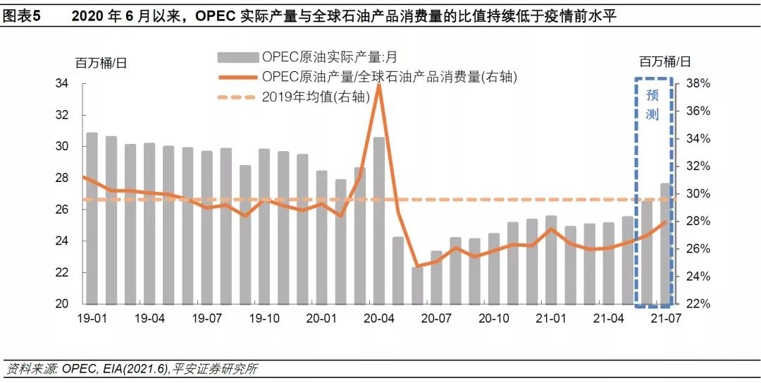 近期OPEC稍微加快了增产步伐,但仍然相对克制。2021年4月,以沙特和俄罗斯为首的23个OPEC+成员国同意5-7月分别增产35、35、40万桶/日,加上沙特将逐步释放之前自愿性减产的100万桶/日,预计7月以前OPEC+总共将增产210万桶/日。最新数据显示,OPEC在5月仅增产39万桶/日,预计俄罗斯增产也较为有限。我们测算,即使OPEC在6月和7月分别增产100万和110万桶/日,OPEC产量与EIA预测的全球石油产品消费量的比值将分别达到27%和28%,仍然低于新冠疫情前水平(图表5)。考虑到210万增产额度还需分摊给俄罗斯等OPEC外的其他产油国,该比值还会更低。