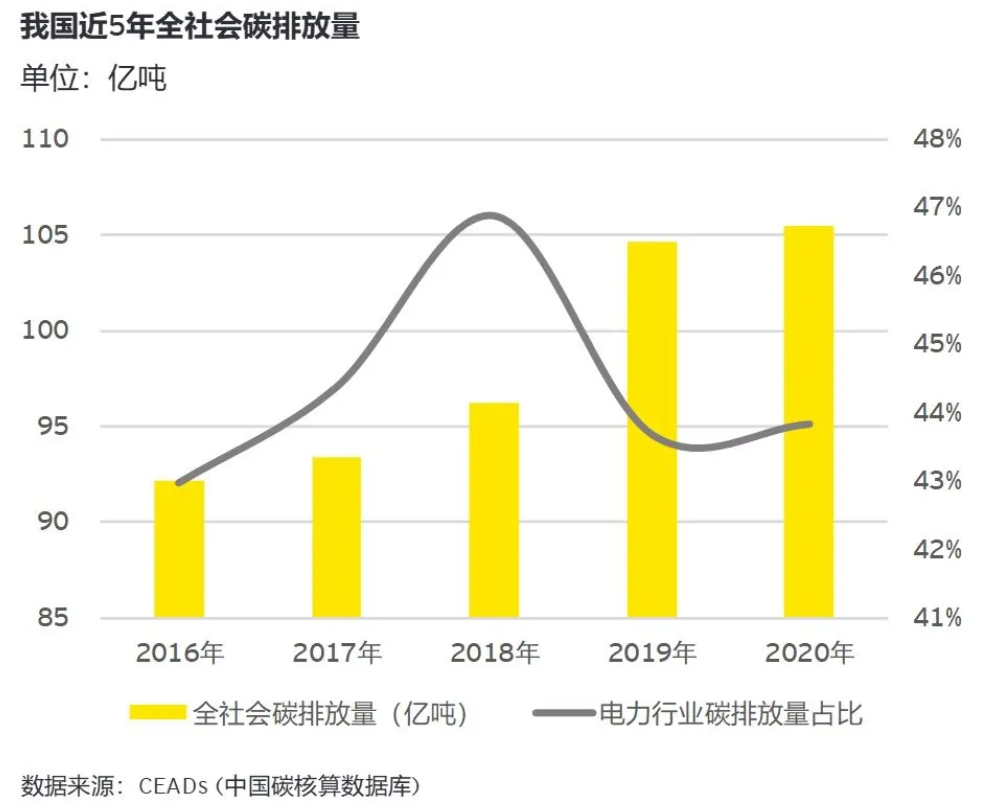 报告指出,“十三五”期间,我国在经济社会快速发展的同时,也加快推进绿色低碳转型,积极参与全球气候治理并取得了突出成效。根据国务院新闻办公室于2020年12月21日发布的《新时代的中国能源发展》白皮书,2019年我国碳排放强度比2005年下降48.1%,提前完成了2015年我国向国际社会承诺的2020年前碳排放强度降低40%-45%的目标。2020年我国全社会碳排放约106亿吨,其中电力行业碳排放约46亿吨,工业领域碳排放约43亿吨。实现双碳目标,电力行业是重中之重。