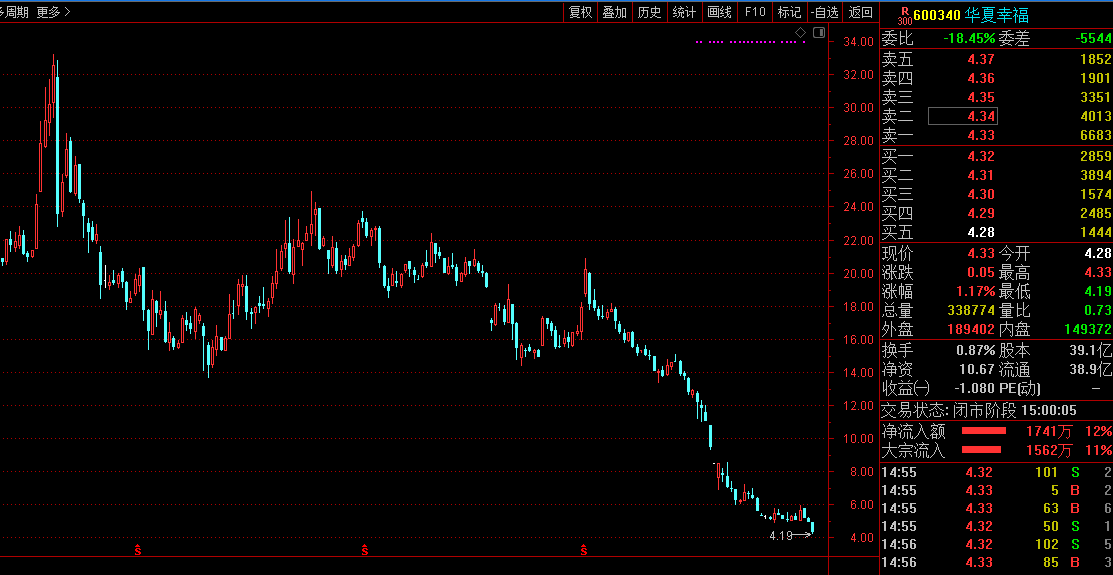 盘面上,华夏幸福今日收报于4.33元,涨1.17%,盘中创出4.19元的近7年历史新低。月内下跌17%,年内下跌66.5%。