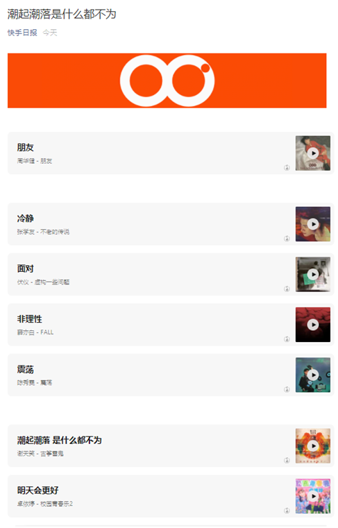 快手日报官微以歌单形式发布一段话,疑似回应近期股价震荡:朋友,冷静面对非理性震荡,潮起潮落是什么都不为,明天会更好。(36氪)