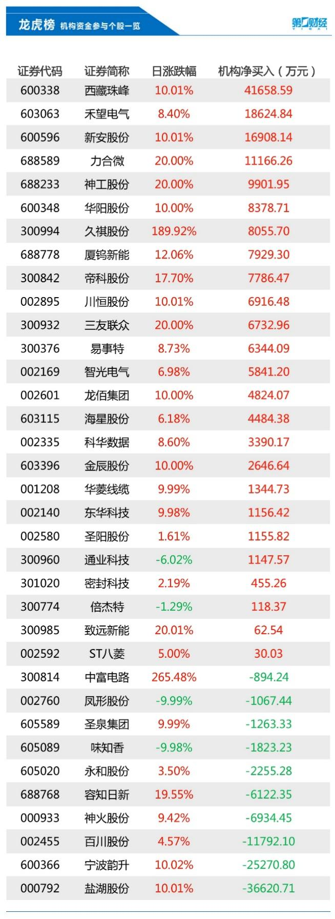 8月12日,共35只个股出现了机构的身影,有25只股票呈现机构净买入,10只个股呈现机构净卖出。当天机构净买入前三的股票分别是西藏珠峰、禾望电气、新安股份,净卖出前三的股票分别是盐湖股份、宁波韵升、百川股份。
