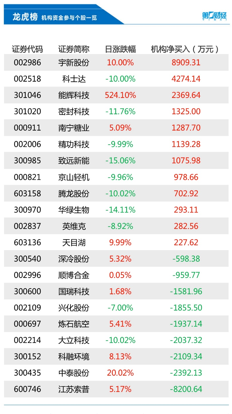 8月17日盘后数据显示,共21只个股出现了机构的身影,有12只股票呈现机构净买入,9只个股呈现机构净卖出。当天机构净买入前三的股票分别是宇新股份、科士达、能辉科技,净卖出前三的股票分别是江苏索普、中泰股份、科融环境。
