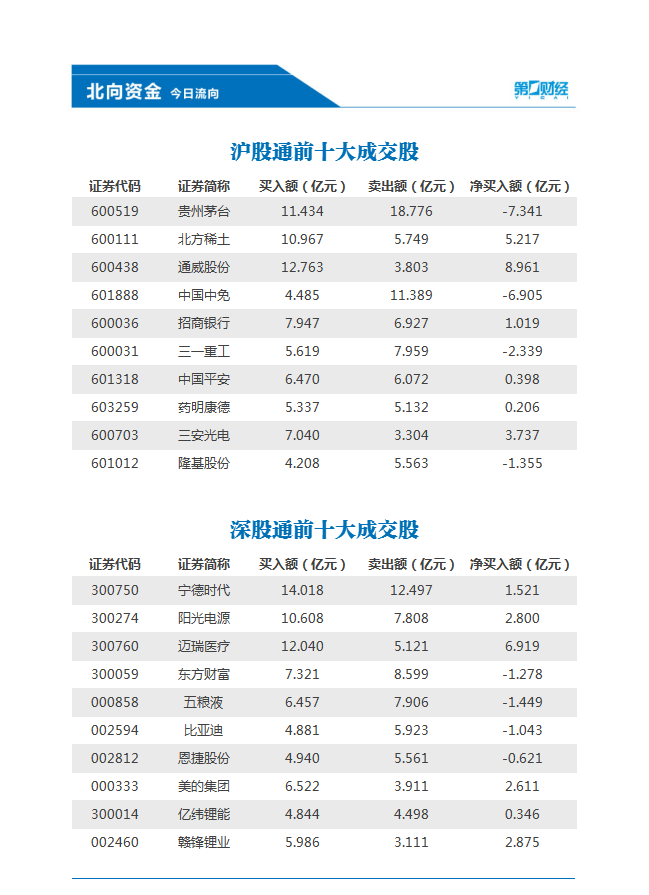 8月17日,北向资金净买入14.75亿元,其中,沪股通净买入5.90亿元,深股通净买入8.85亿元。前十大成交股中,通威股份、迈瑞医疗、北方稀土买入额位列前三,贵州茅台、中国中免、三一重工净卖出额位列前三。