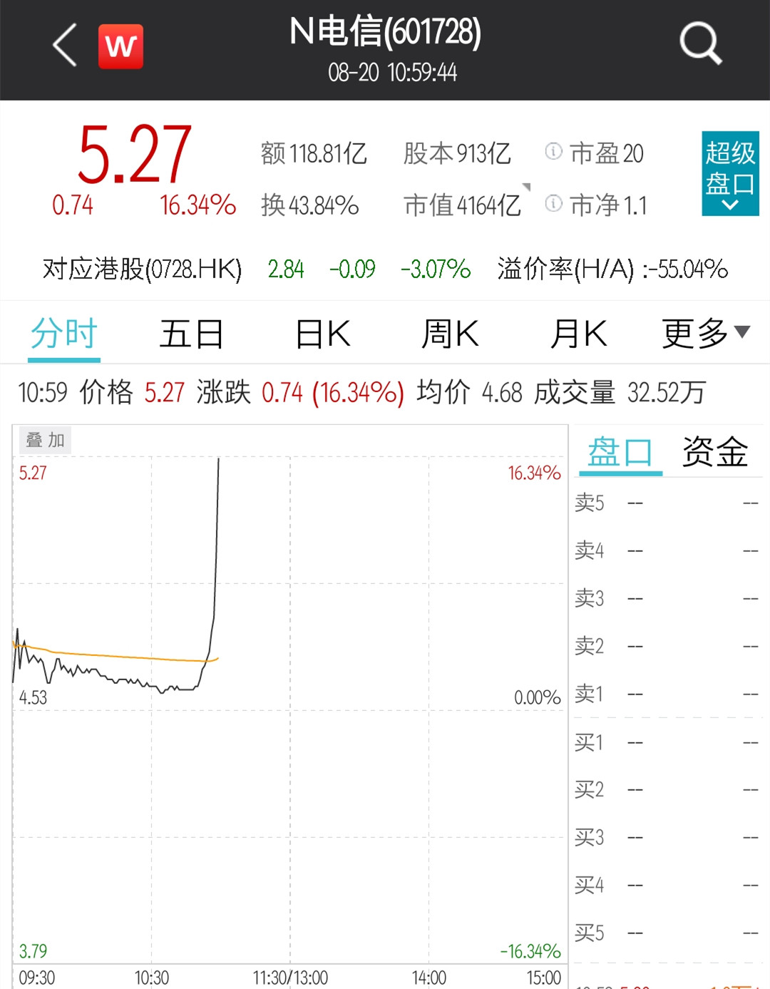 8月20日,中国电信A股(N电信)午前突然直线拉升,股价涨超16%,触发临时停牌,目前股价报5.27元,总市值4164亿元。