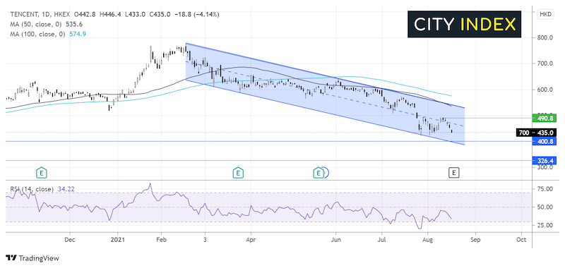 腾讯股价自2018年底开始稳步走高,新冠大流行背景下,自2020年3月中旬的约326港元一路上攻,于今年2月中旬站上775.6港元历史高点。华纳表示,此后,股价于下降通道内构筑一系列低点降低和高点降低,7月底探入422.港元一线15个月低点(8月23日收于433港元)。“即时支撑见于7月低点422港元,若下破,2020年5月低点和下行通道下轨400港元或提供支撑,反之,买盘需看到股价升穿488港元水平阻力位,才能看向535港元50均线和下行通道上轨,要拿下这个价位可能并不容易。”