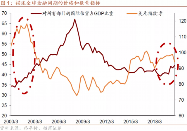 三是前提假定不同,传统经济周期以理性人为前提,金融周期则以阶段性的非理性或群体效应为前提。当然,金融周期和经济周期并不能简单分割,特别是当经济周期和金融周期处于同样的扩张或者收缩阶段时,将形成共振,放大经济和金融周期的波动幅度。通过对比了解金融周期后,将其范围扩大到全球,就是全球金融周期,即在全球范围内存在共同的金融周期。这个新概念最早是在2014年由法国的经济学家提出,国际清算银行非常推崇并持续开展有关研究。全球金融周期可以用美元指数和VIX等一系列价格指标来描述,也可以用全球信用(Credit)与GDP之比等数量指标来描述。