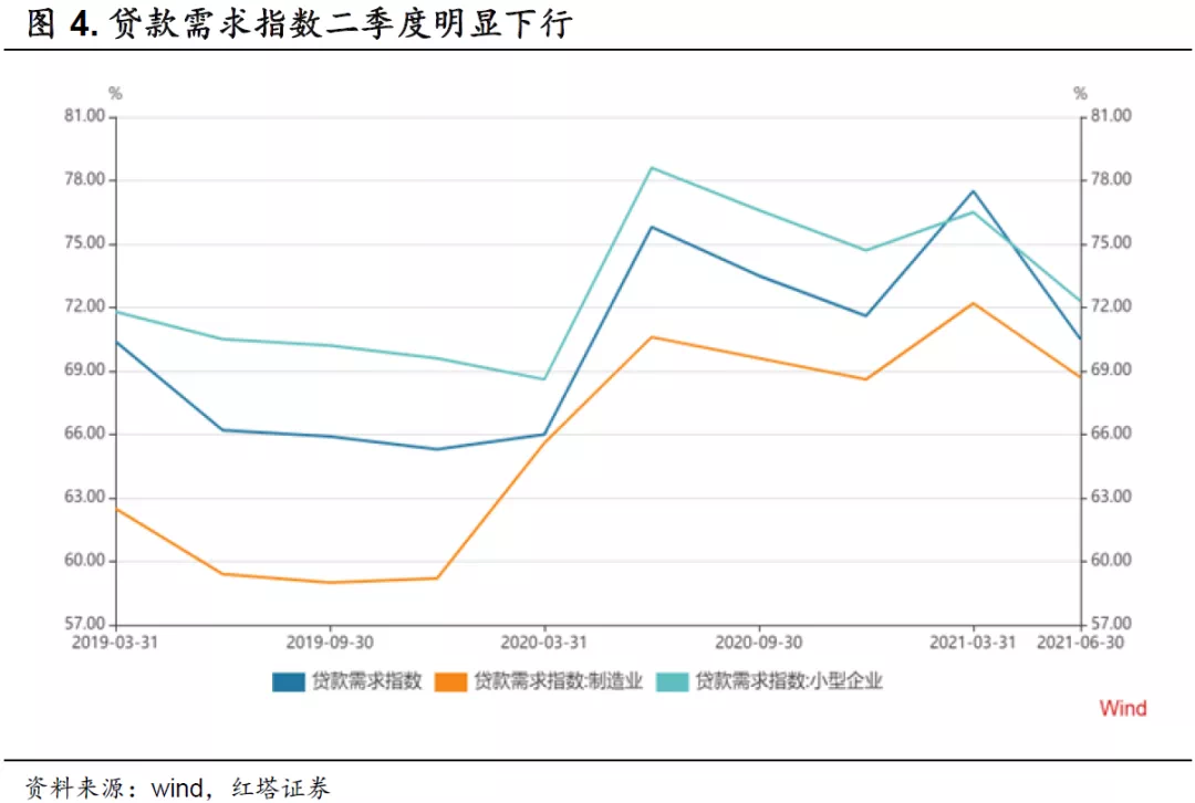 在制造业投资偏弱、主动补库存又即将结束的时候,制造业企业的融资需求自然会明显走弱。可以看到制造业的贷款需求指数也从一季度的72.2下降到了二季度的68.7。