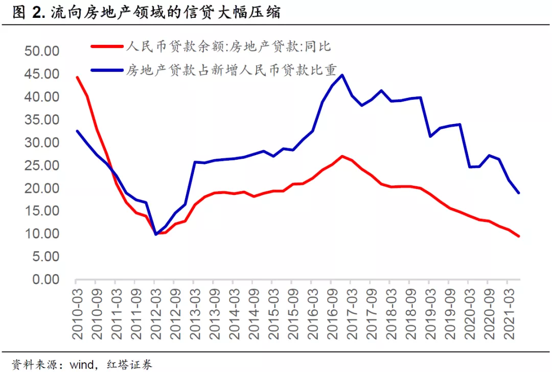 于是,今年流向房地产领域的信贷出现了明显的下滑,截至今年二季度末,新增房地产贷款占新增人民币贷款的比重仅有18.9%,相比于2020年全年跌了6.5个百分点。房地产开发贷款同比增速仅有2.8%,增速比上年末低3.3个百分点。