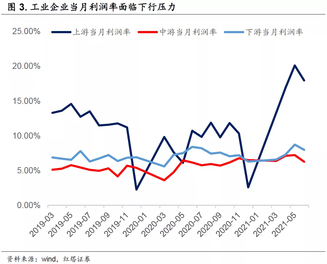 目前工业企业的利润率已经开始下滑。6月当月工业企业利润率为7.12%,5月8.01%,尤其是下游工业企业利润率,因为要承受上游原材料价格上涨的压力,利润率下降的压力显然要更大一些。
