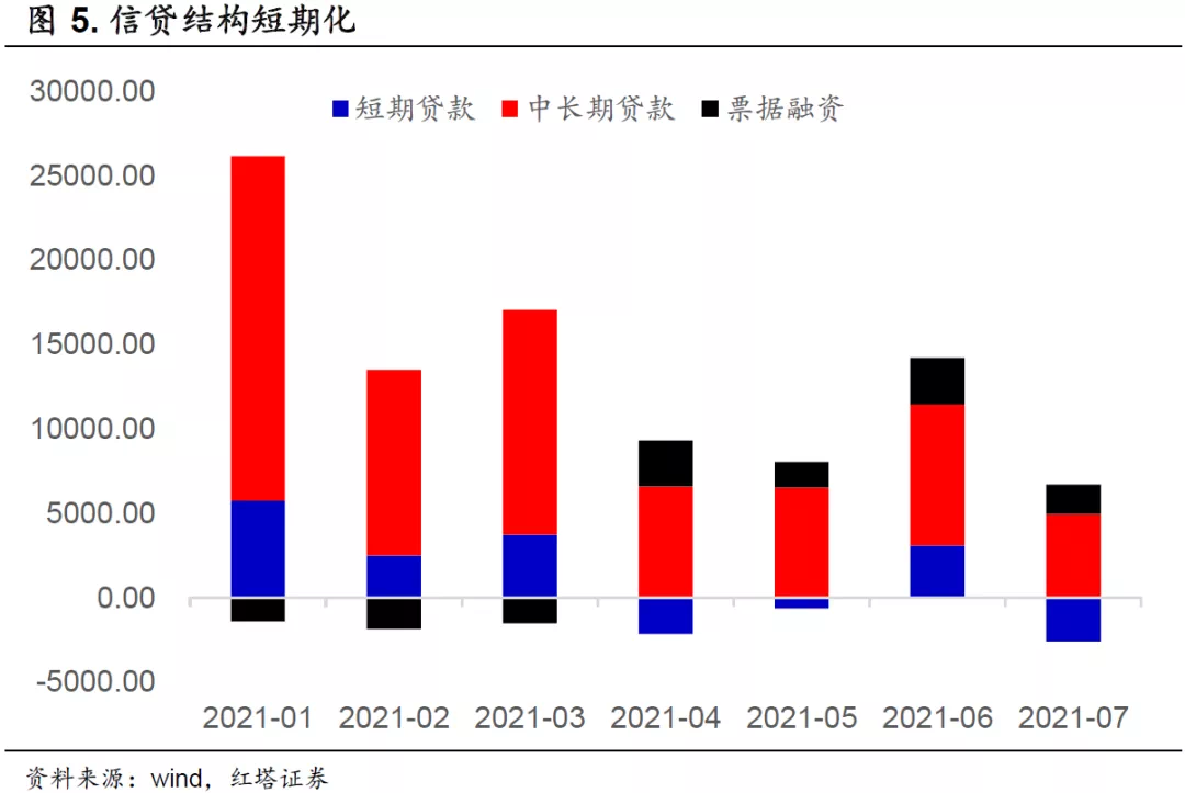 信贷结构恶化的直接体现就是信贷投放资金期限开始短期化。2021年4月~7月,票据融资的规模达到了8767亿元,占企业信贷比重的25%。但从支持实体经济的效果来看,中长期信贷占比高,显然要更好一些。