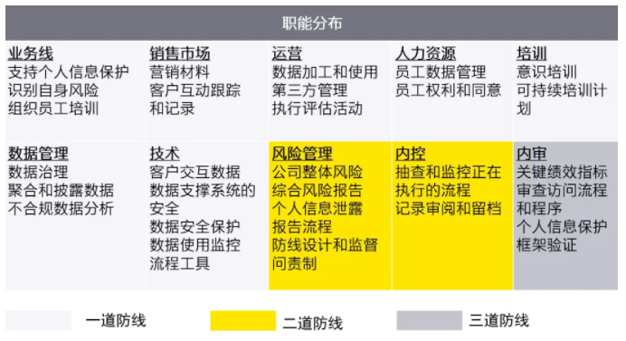 三道防线:主要职责是对个人信息保护的审计,由企业的审计监督部门负责,负责验证关键绩效指标、审查访问流程和程序、个人信息保护框架验证等。