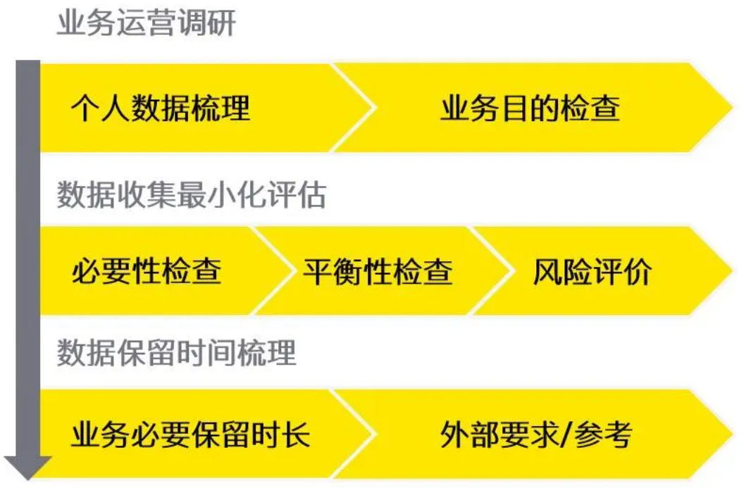 个人信息的最小化管理涉及个人信息收集、使用、存储、销毁的全生命周期环节,应重点关注个人信息收集最小化、权限最小化及存储时限最小化三个方面: