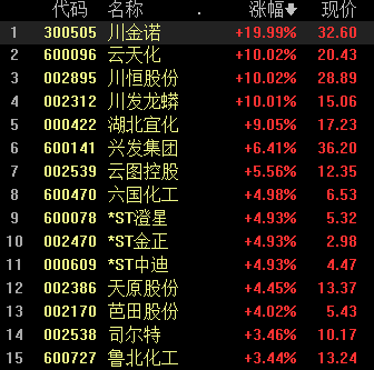 8月27日,磷化工板块持续拉升,截至发稿,川金诺、云天化、川恒股份、川发龙蟒涨停,湖北宜化涨9%,兴发集团涨6%,云图控股、晨化股份等纷纷跟涨。