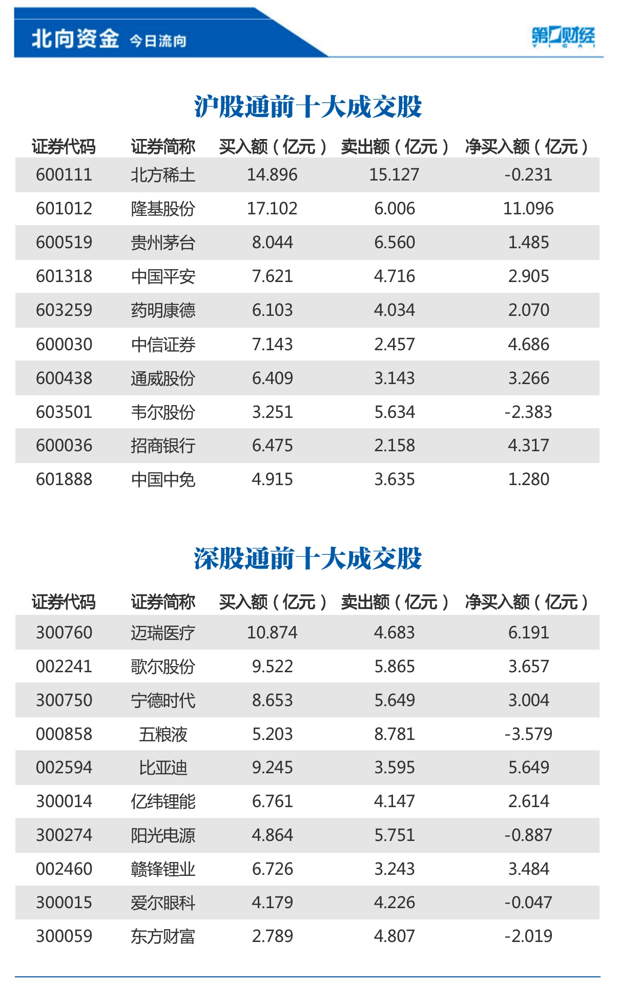 前十大成交股中,隆基股份、迈瑞医疗、比亚迪买入额位列前三,分别获净买入11.1亿元、6.19亿元、5.65亿元。