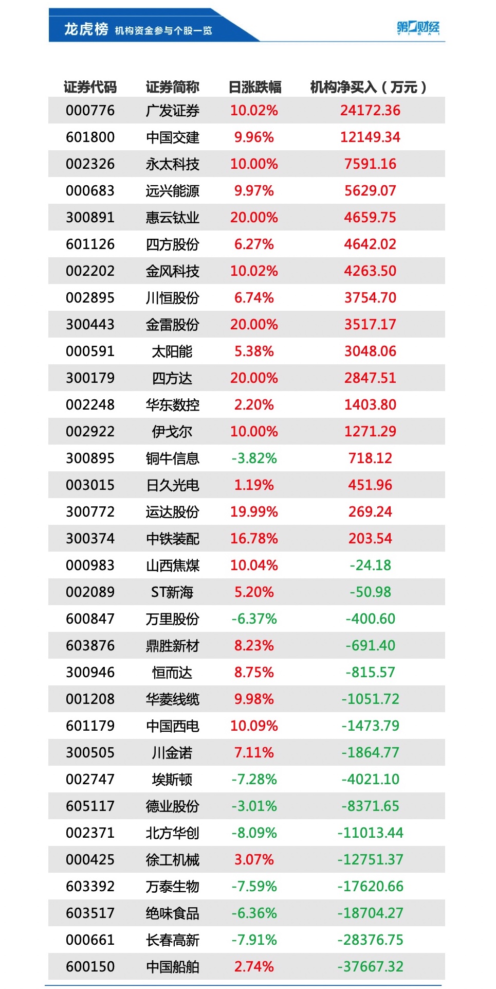 当天机构净买入前三的股票分别是广发证券、中国交建、永太科技,净买入金额分别是2.42亿元、1.21亿元、7591万元。