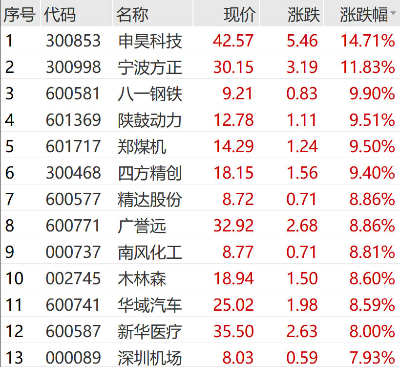 今日两市共有35只个股涨停破板,申昊科技涨超14%,宁波方正涨超11%,八一钢铁、陕鼓动力、郑煤机、四方精创涨超9%;今日共有10股跌停开板,世联行跌超8%,格力地产跌近7%,仅华菱线缆收涨1.01%。