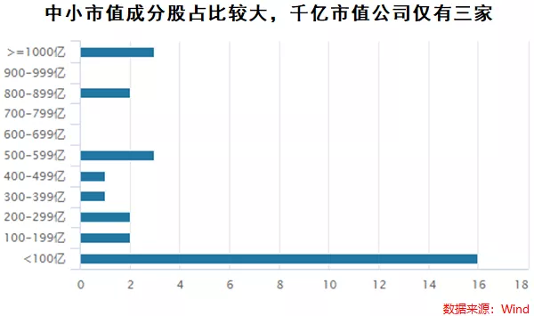 市值分布方面,指数以中小盘为主,有16只、超过一半的成分股市值在100亿以下,千亿以上的成分股仅有三家,分别是中国中免、中国国航、南方航空。