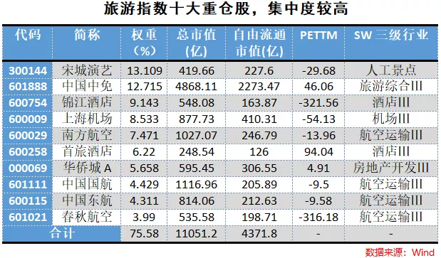 旅游指数最多可以选取行业中的50只个股,而目前指数中仅有30个成分股,前十大重仓股的权重占比超过75%,前三大权重股占比超过 35%,指数的集中度较高,龙头股的带动效应较强。