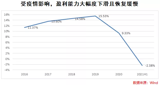 但相比于其他行业,旅游受到疫情的冲击影响较大,盈利能力大幅度下降,ROE从2019年的15.53%骤降至2020年的9.33%。同时,旅游业疫后的恢复也较慢,截至2021年上半年,ROE为-2.38%,行业呈整体亏损的状态。