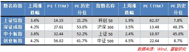 上周A股市场指数集体上涨,其中中证500上涨4.5%,创业板和深证成指均上涨4.2%,科创板上涨1.9%相对落后。