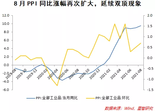 PPI涨幅扩大,略超预期,主要有两个原因:一是价格传导导致的涨价面扩大,涨价更具普遍性;二是若干种类的商品涨价带动,例如进口天然气价格快速上涨、夏季发电需求带动煤炭价格上涨、能耗和环保控制导致铝价创新高。
