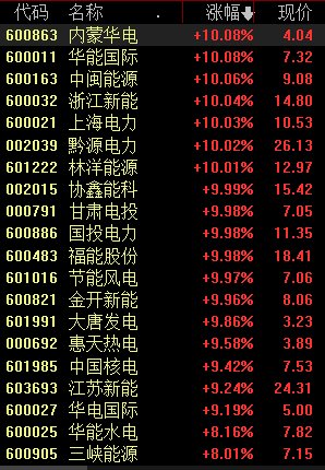 9月22日,电力、风电板块大幅拉升,领涨两市。截至发稿,板块内多只个股涨停,其中包括内蒙华电、中闽能源、浙江新能、上海电力等,其余个股均不同程度上涨。