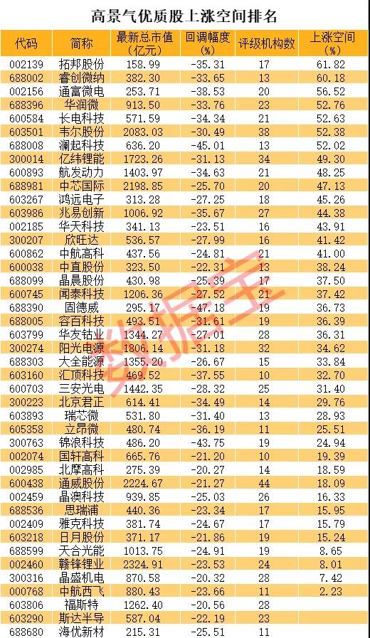 股价调整之后部分个股机构一致预测上涨空间更为可观。具体看,拓邦股份和睿创微纳两只个股机构一致预测上涨空间均超60%,通富微电、华润微、长电科技等个股机构一致预测上涨空间均超50%。(数据宝)