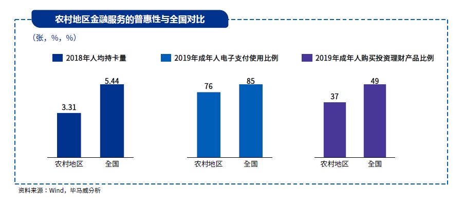 我国中低收人人口仍然有将近6亿,其中农村地区人群在金融服务的可得性和便利性上仍有较大发展空间。根据央行公布的普惠金融调研数据,农村地区人群无论是在人均持卡量、成年人电子支付比例和购买理财产品比例上,皆与全国平均水平存在较大差距。