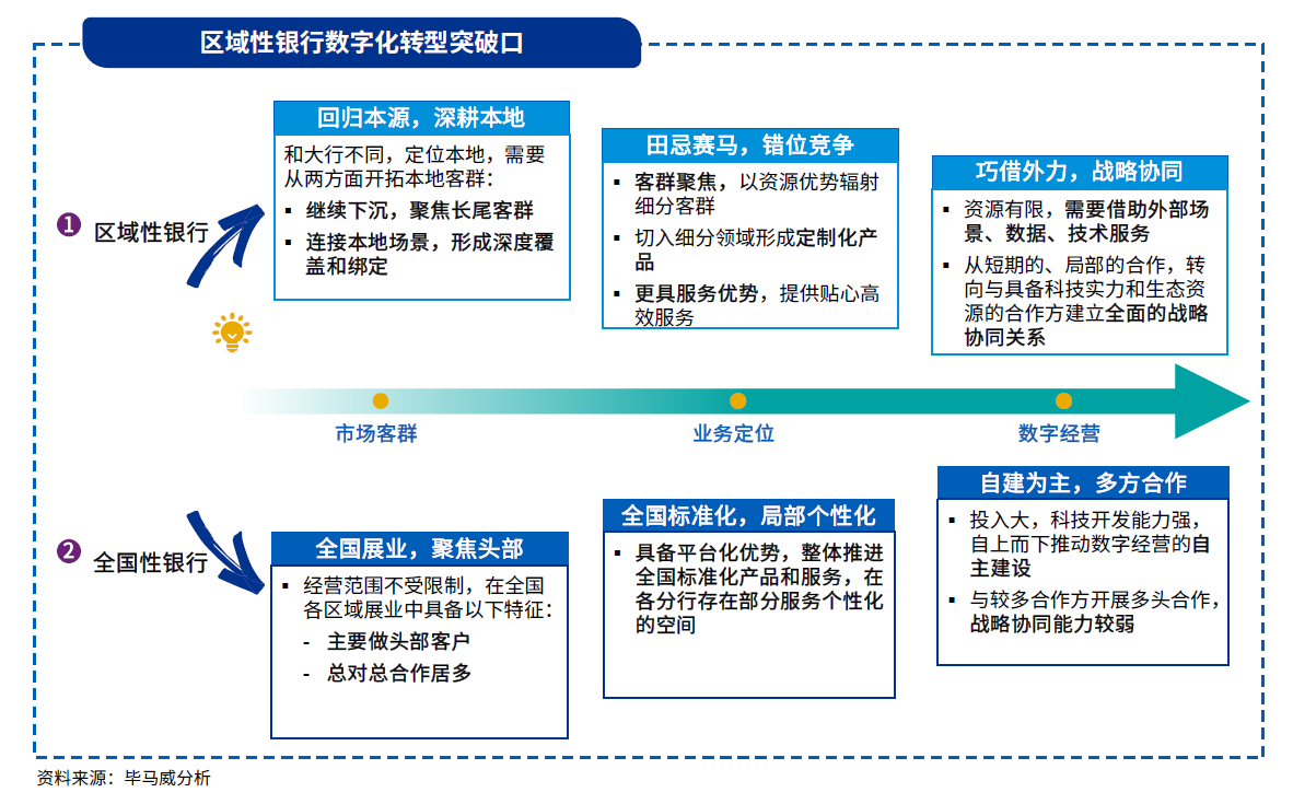 我们建议,区域性银行应通过充分挖掘自身优势和差异化经营,将本地特色优势转化为发展胜势,通过深耕本地、错位竞争、巧借外力明确数字化转型三大突破口。
