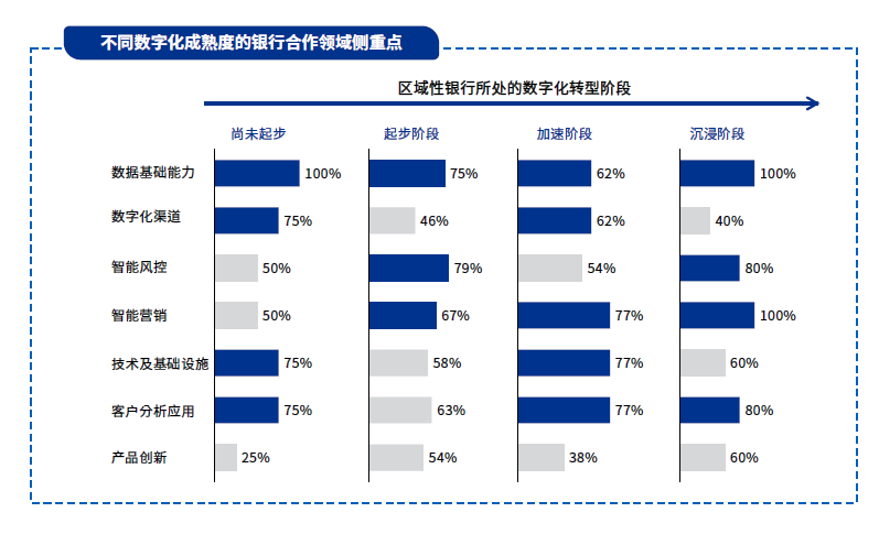 区域性银行需要基于自身发展阶段和需求,识别战略合作机会点。我们的问卷调研发现,不同数字化阶段的银行在开展外部合作时存在差异化需求,其中尚未起步的银行更加关注数据积累、数字化客户识别与洞察、数据技术与基础设施以及数字化渠道建设;然而处于沉浸阶段的银行更加注重数据应用、智能营销、数字化客户识别和洞察以及风控领域的外部合作。我们建议区域性银行依据自身战略规划,明确关键技术、数据和场景合作领域,形成对外合作战略图景。