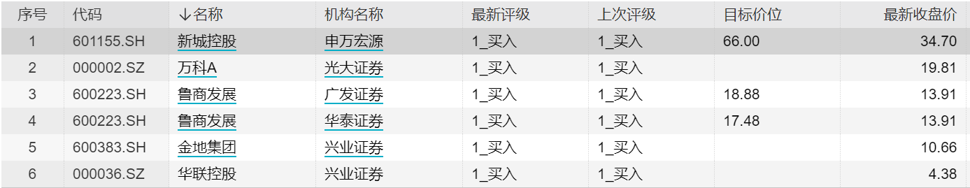 据Wind数据,近五日共5只地产股获机构推荐,新城控股、万科A、鲁商发展、金地集团、华联控股均获“买入”评级。